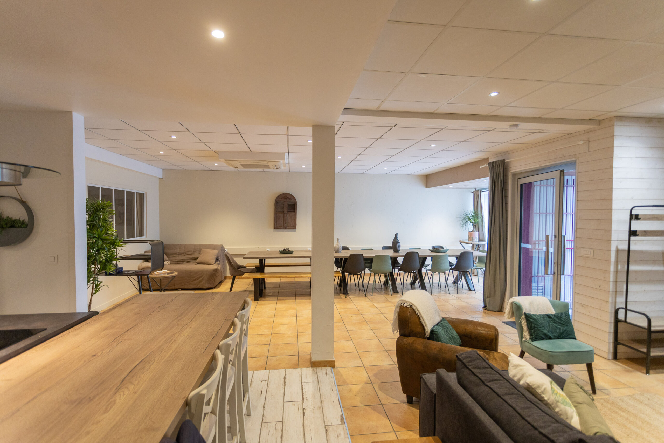 réception de 80M2 avec tables et chaises pour 15 à 20 personnes, une cuisine toute équipée, des sanitaires, un coin séjour/télé, le wifi, un grand écran pour